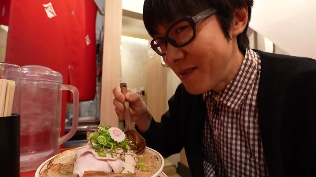 当初、デカ盛りを食べる筈が、はいじぃさんがご来店されるタイミングで「メガ盛り」メニューを考案した店主。早速メガ盛りを食べ進めるはいじぃさん。